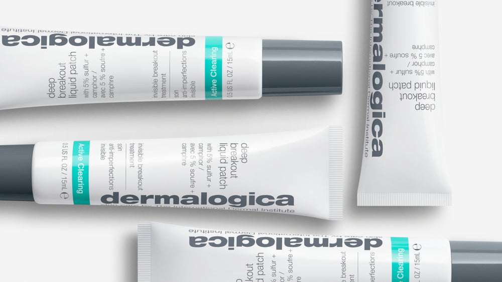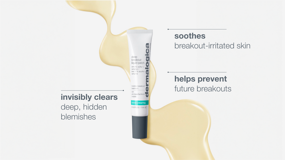 A tube of Dermalogica Deep Breakout Liquid Patch is shown with text highlighting its benefits: invisibly clears deep, hidden blemishes, soothes breakout-irritated skin, and helps prevent future breakouts.